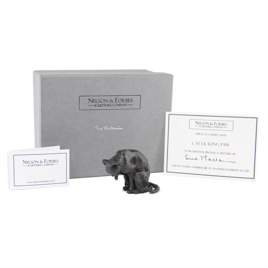 This Sue Maclaurin solid bronze sculpture of a Cat Licking Paw is a foundry casting by Nelson & Forbes of her original sculpture.
