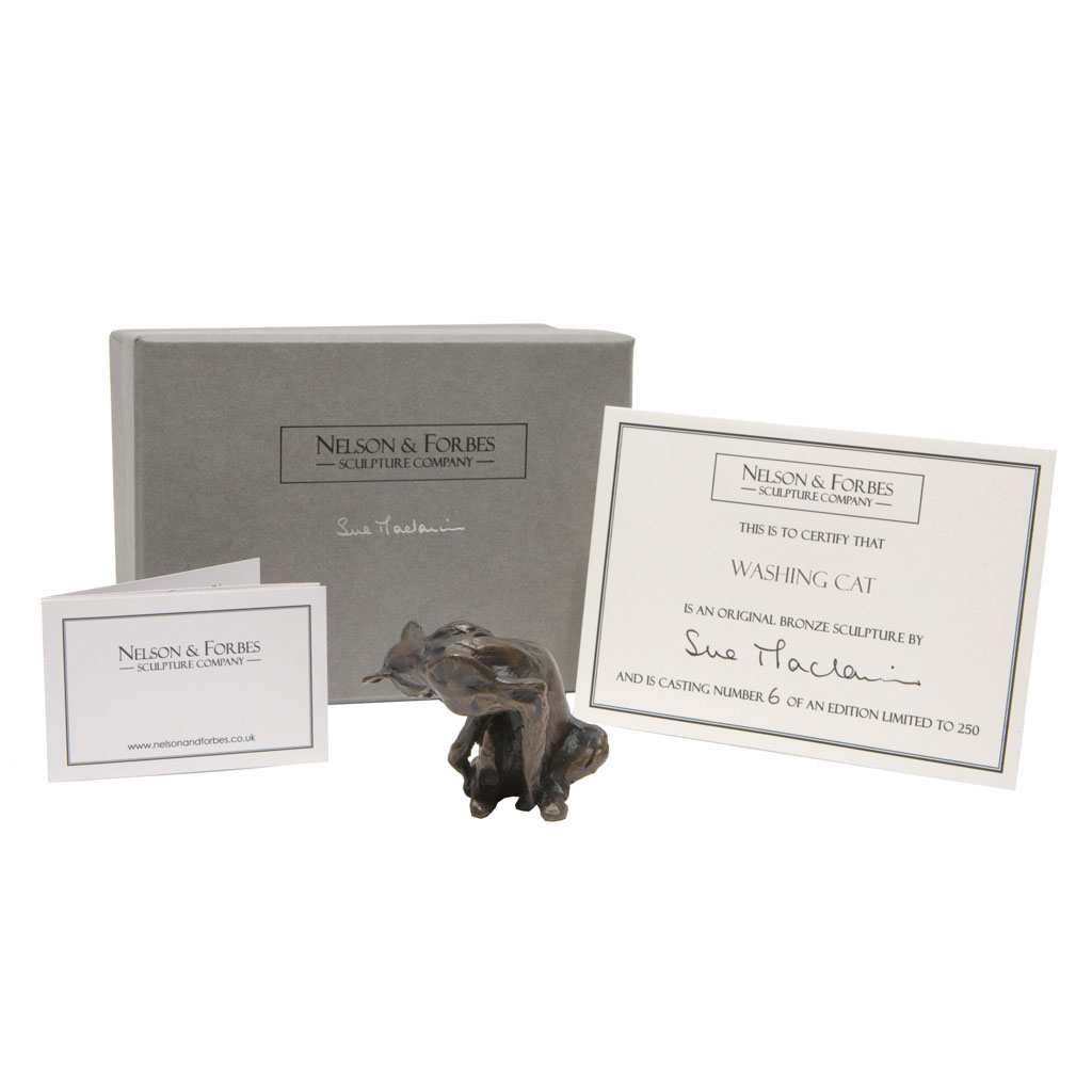 This solid bronze sculpture of a Sue Maclaurin Washing Cat is a foundry casting of her original sculpture. Her model was the oriental (Burmese Siamese cross) cat who shares her life and this is an affectionate portrait of a lively and charismatic cat.