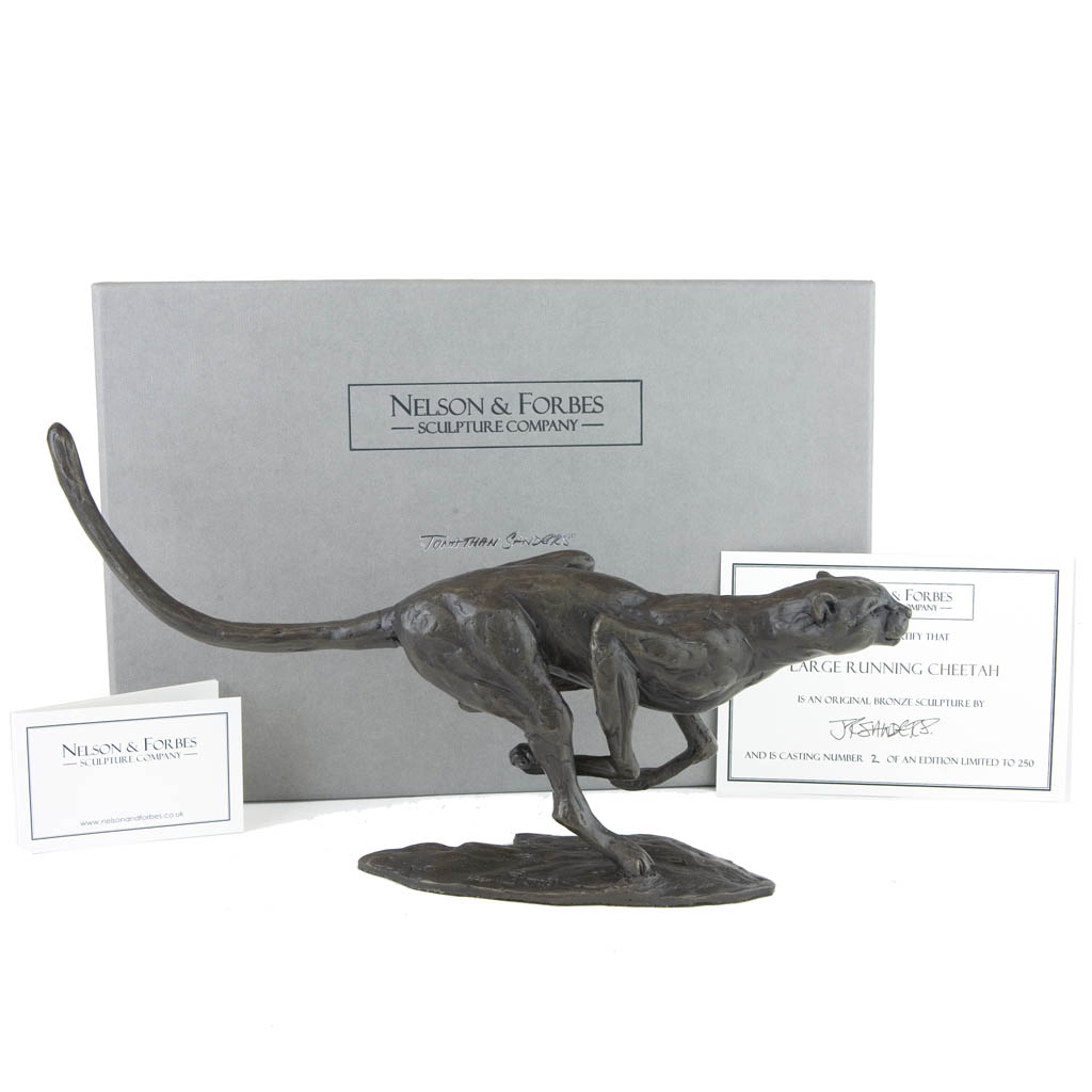 We cast this sculpture in our British foundry as a strictly limited edition of 250 castings worldwide and it arrives beautifully presented in our signature hand made gift box, accompanied by an artist signed and numbered certificate of authenticity.  Every casting of Large Running Cheetah bears our ‘NF’ maker’s mark, Jonathan Sanders’s signature and is engraved with its own unique edition number.
