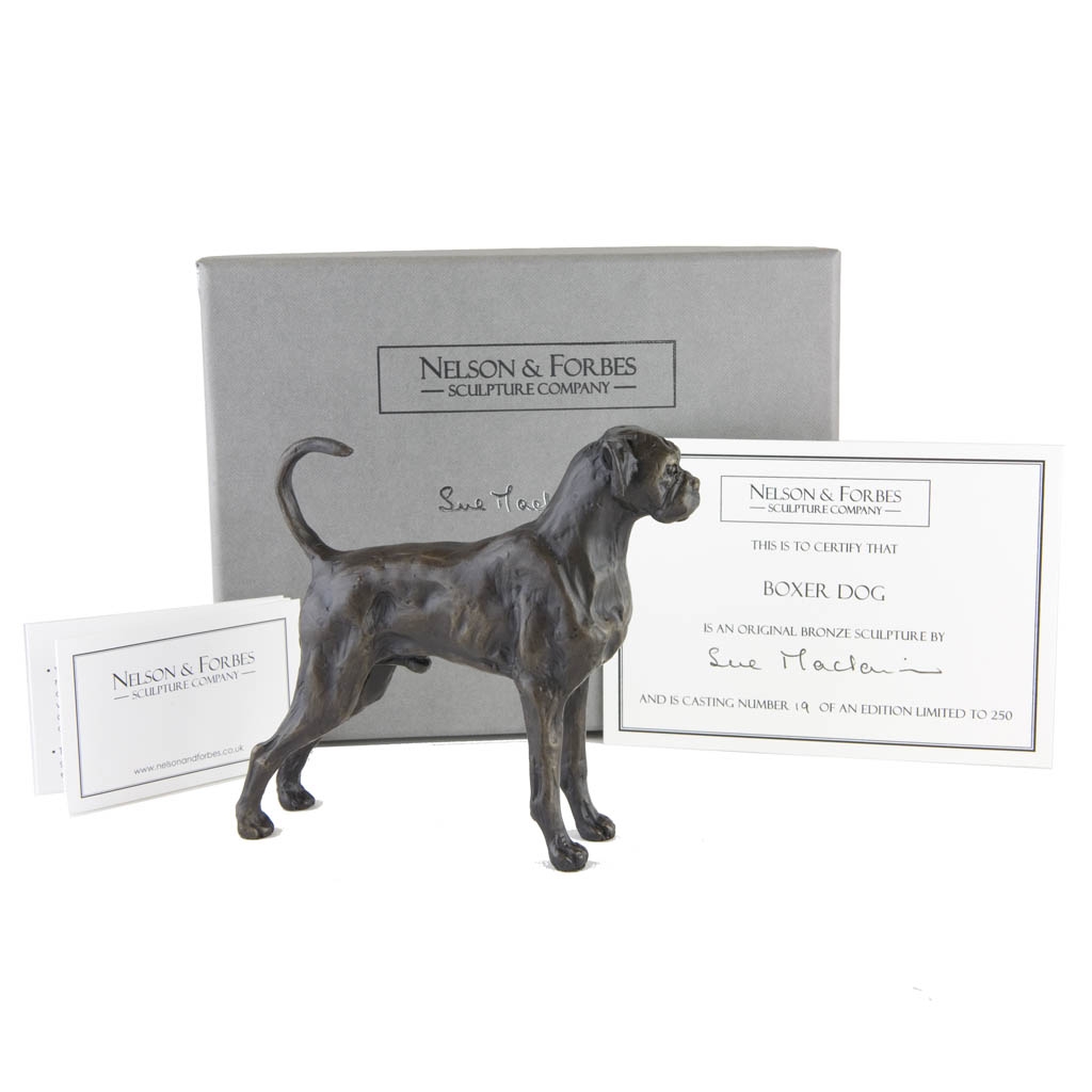 We have also been asked by many Boxer lovers to create a Boxer with a docked tail, so we were happy to oblige. Both our docked and undocked Boxer Dog sculptures are taken from a single edition of 250 castings. We first made a mould of the undocked Boxer, before Sue Maclaurin modified the tail on her original sculpture. We then made a second mould of the Boxer, now with a docked tail, to create bronze castings of the Boxer sculpture with a docked tail. This means that only 250 castings of the Boxer Dog will ever be made, some with a docked tail and some with an undocked tail. If you have any questions about this, please do call us on 01442 256290.