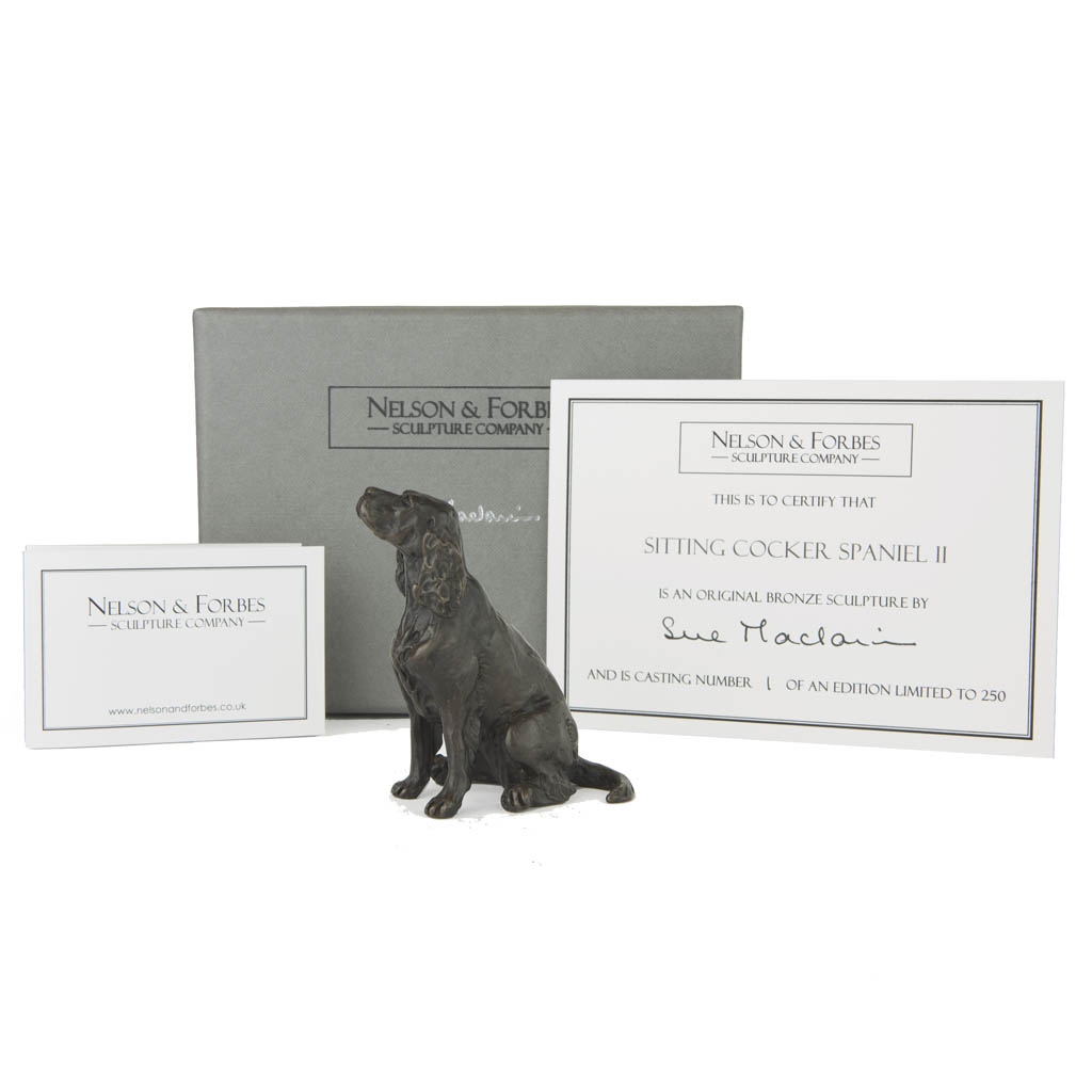 Sitting Cocker Spaniel II has been carefully hand cast in solid bronze in a British foundry using the ancient lost wax technique of casting bronze. Each casting in the limited edition of 250 worldwide is entirely cast by hand, with a new mould being created and then destroyed during the weeks long casting process required for every casting.
