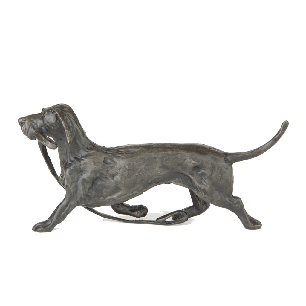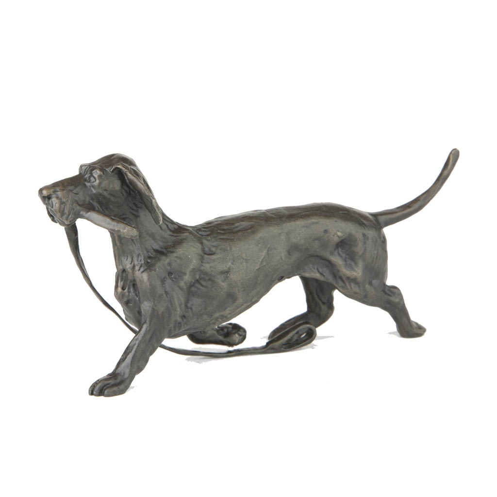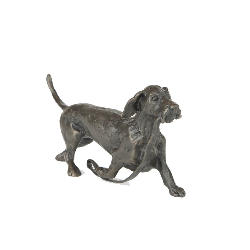 Sue Maclaurin’s gorgeous bronze sculpture of a Trotting Wire Haired Dachshund perfectly captures the cheeky and willful character of these characterful dogs as it trots along with its lead, with places obviously to be and people to see.
