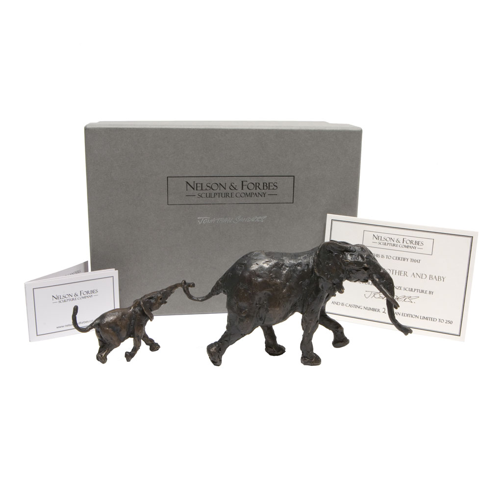 This Jonathan Sanders bronze sculpture ‘Elephant Mother and Baby’ was carefully hand cast by Nelson & Forbes in a British foundry, in an edition of just 250. It is presented in a high quality English hand made gift box and is accompanied by a numbered certificate of authenticity, signed by the artist, Jonathan Sanders.
