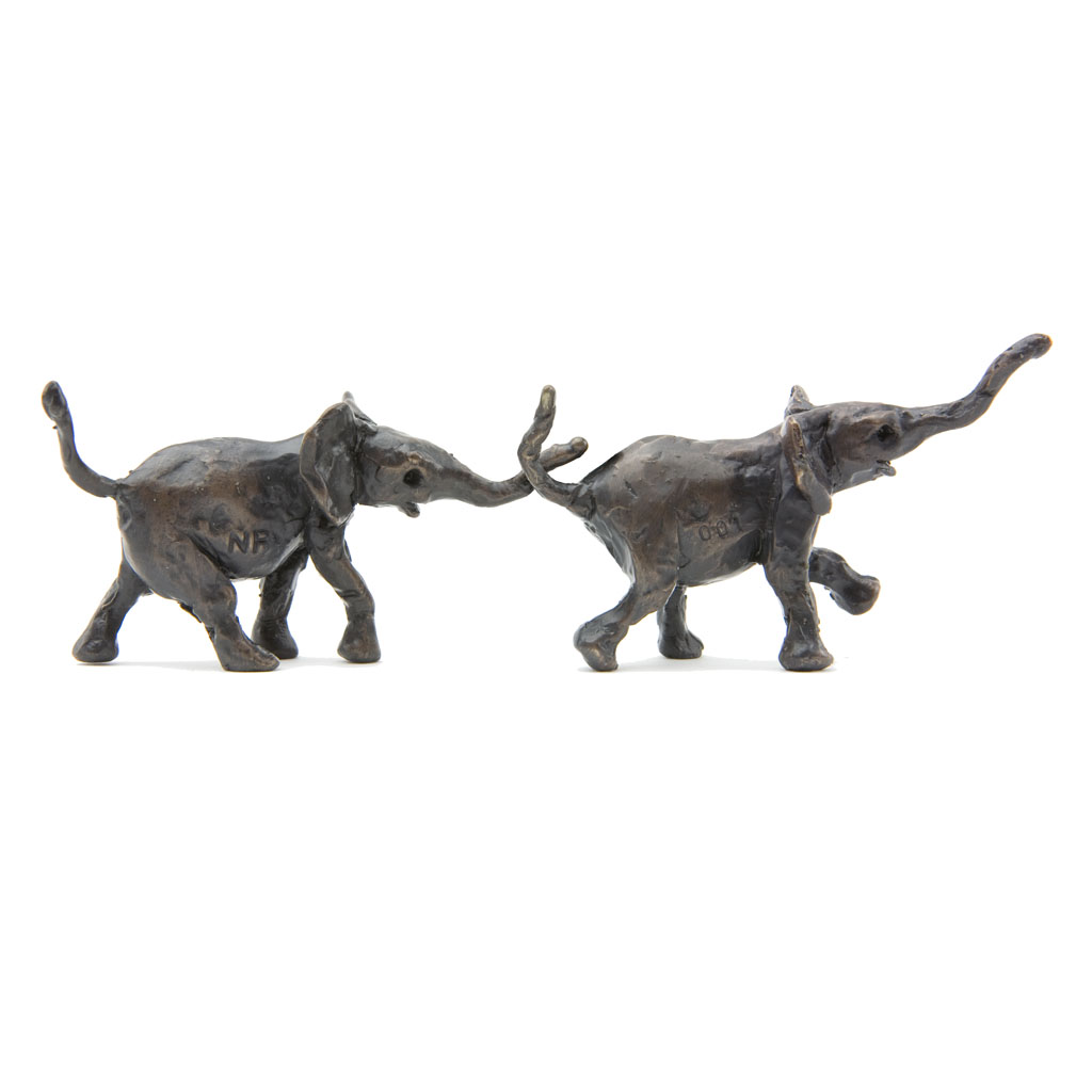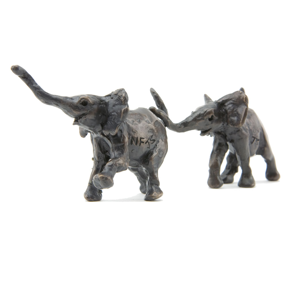 Many thanks for the small bronzes which we are both very pleased with, we laughed out loud at the humour of the situation that they depict. One can almost see the African dust rising from these two young elephants as they charge about, not entirely in control of themselves, especially their trunks. We love elephants generally but the babies are pure magic. We shall keep you in mind for future buys.