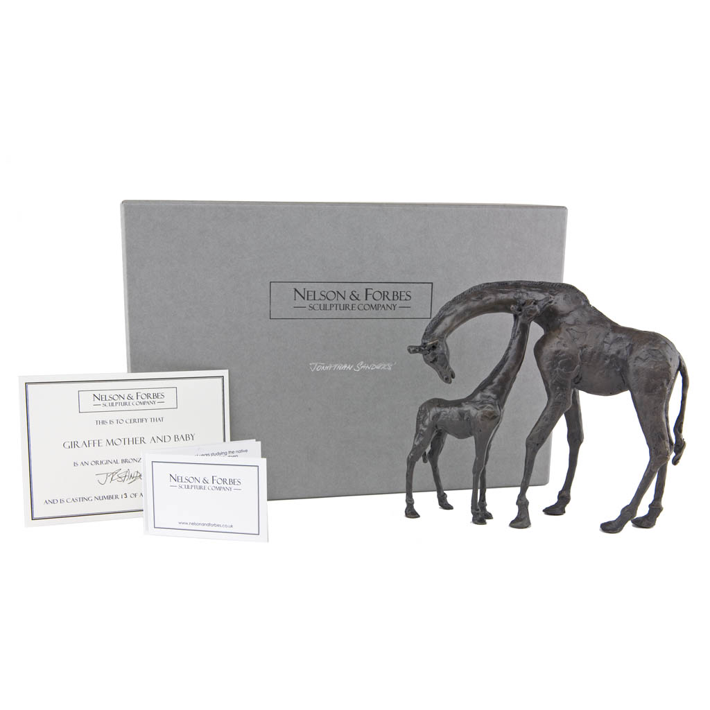 This Jonathan Sanders bronze sculpture of a Giraffe Mother and Baby was cast by hand in a British foundry by Nelson and Forbes, in an edition of just 250. It is presented in a high quality hand made gift box and is accompanied by a numbered certificate of authenticity, signed by the artist, Jonathan Sanders.