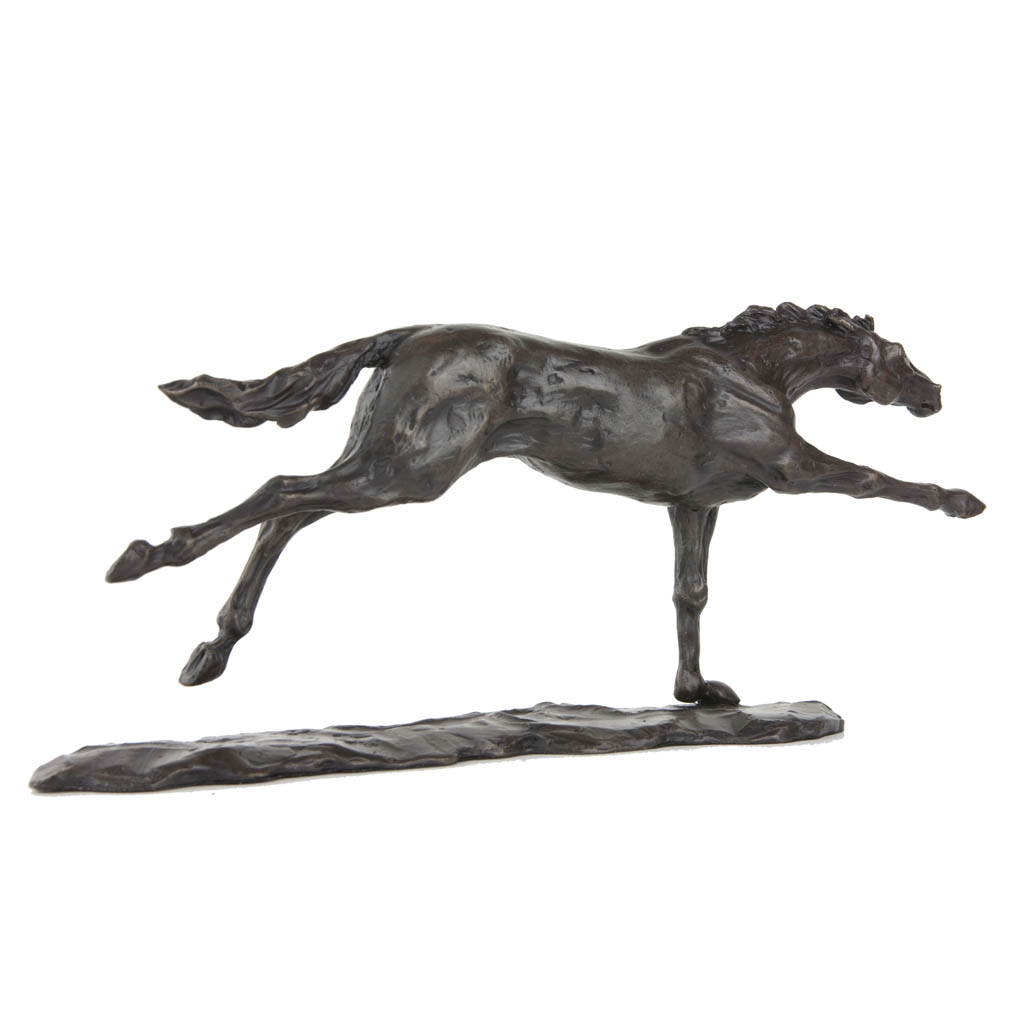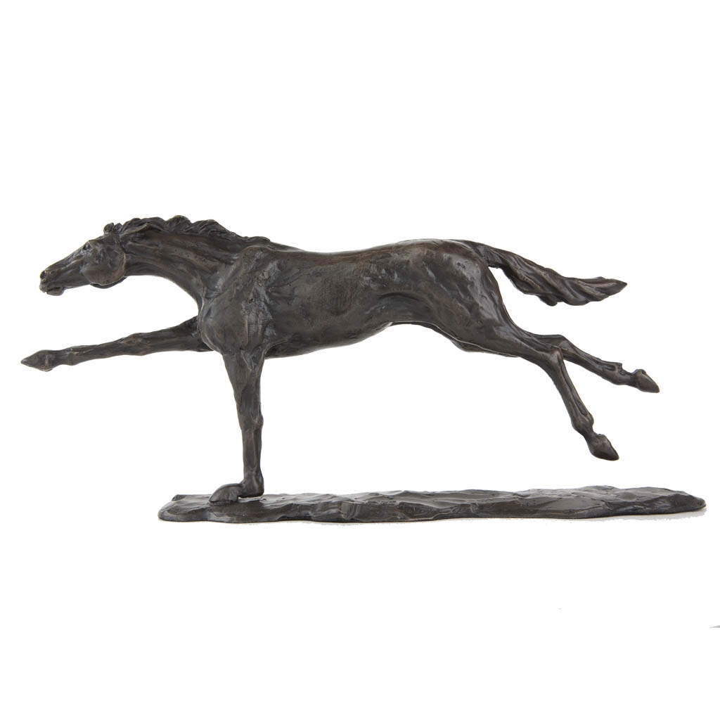 This is an unusual sculpture, that powerfully conveys the love and understanding of the sculptor for her subject. Arguably it shows a thoroughbred at its very best – doing what generations of ancestors have been bred to do – at the peak of its performance.