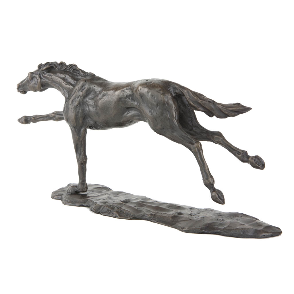 This piece has been created in response to collectors who have asked specifically for a thoroughbred or racehorse. Sue Maclaurin knew from the outset that she wanted to sculpt the subject a full stretch, highlighting its desperate innate desire to win, to be first. When sketching her early ideas for this piece, she considered whether to include a jockey, but chose instead to show just the form and movement of the horse alone, to be enjoyed from every angle uninterrupted.