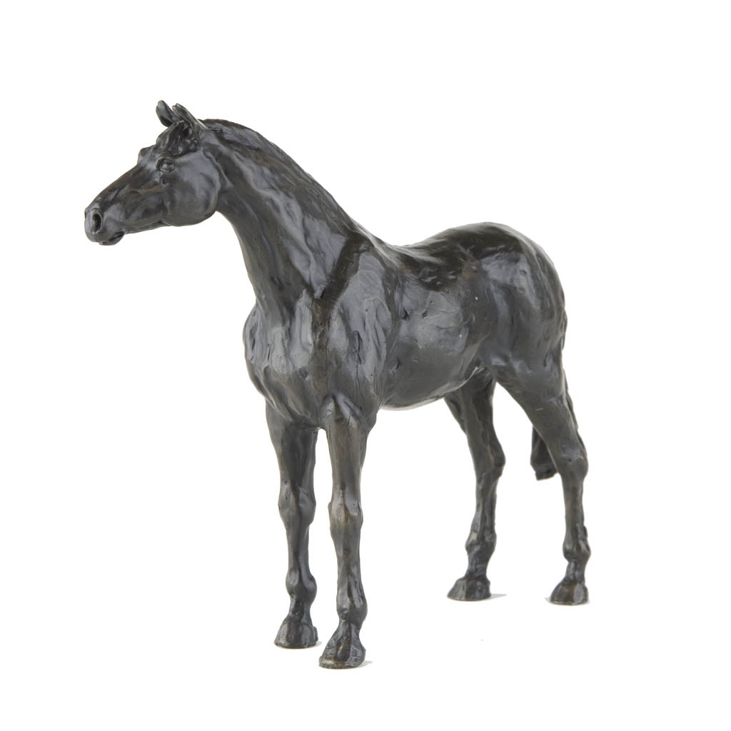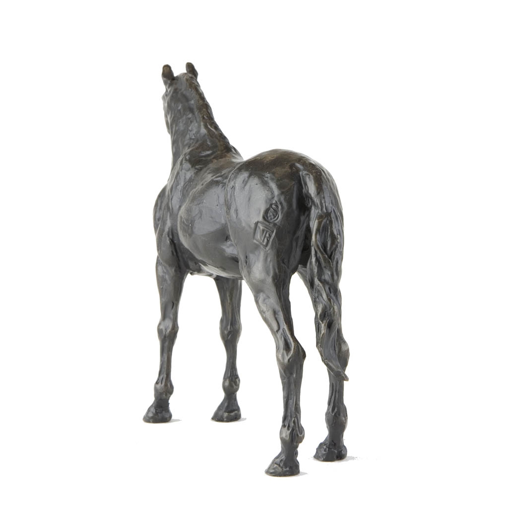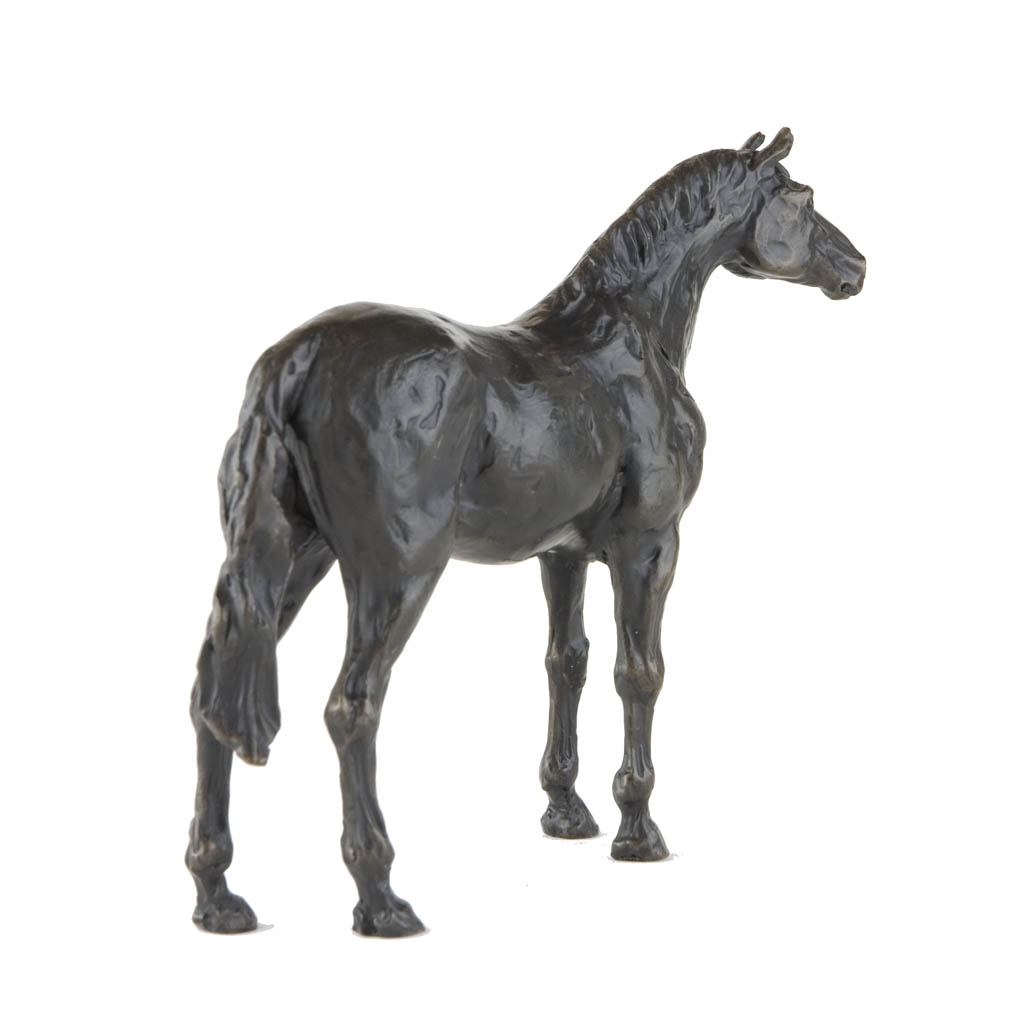 This delightful bronze sculpture captures a horse in a quiet moment, standing in the field or yard, the moment something has captured its attention.