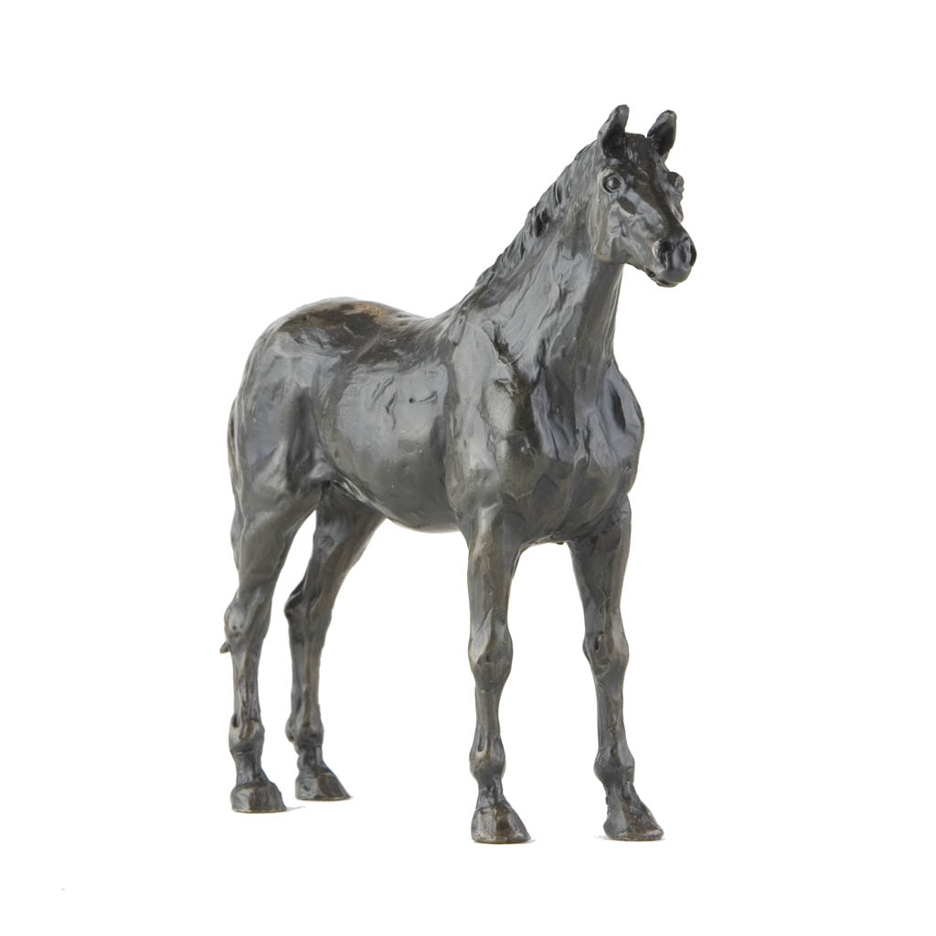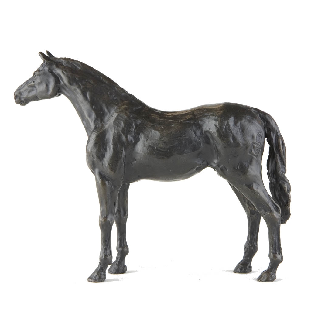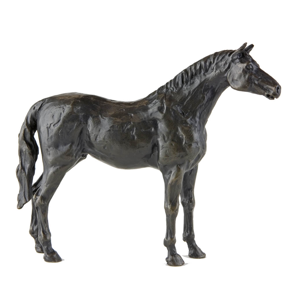 This delightful bronze sculpture captures a horse in a quiet moment, standing in the field or yard, the moment something has captured its attention.