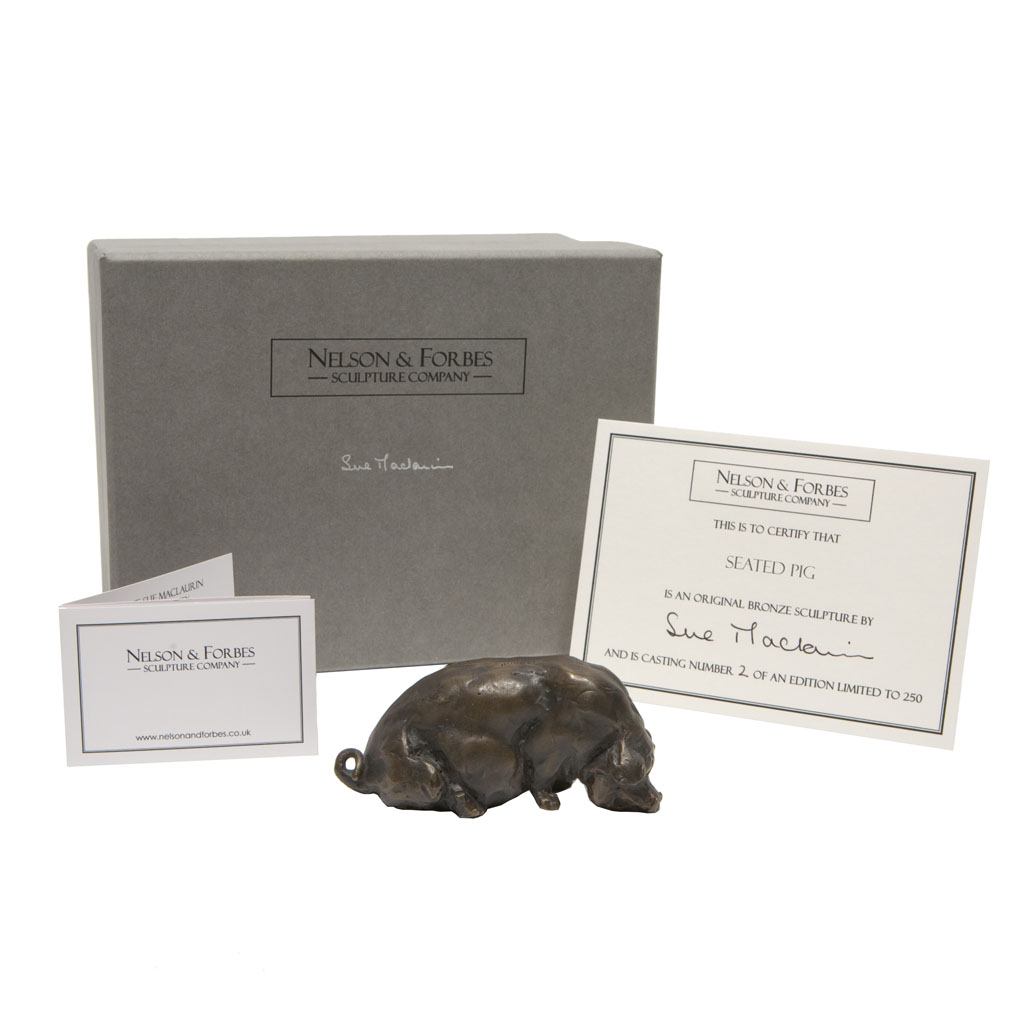 This wonderful solid bronze sculpture of Sue Maclaurin’s Seated Pig is a foundry casting of her original sculpture and took two weeks to create by hand.