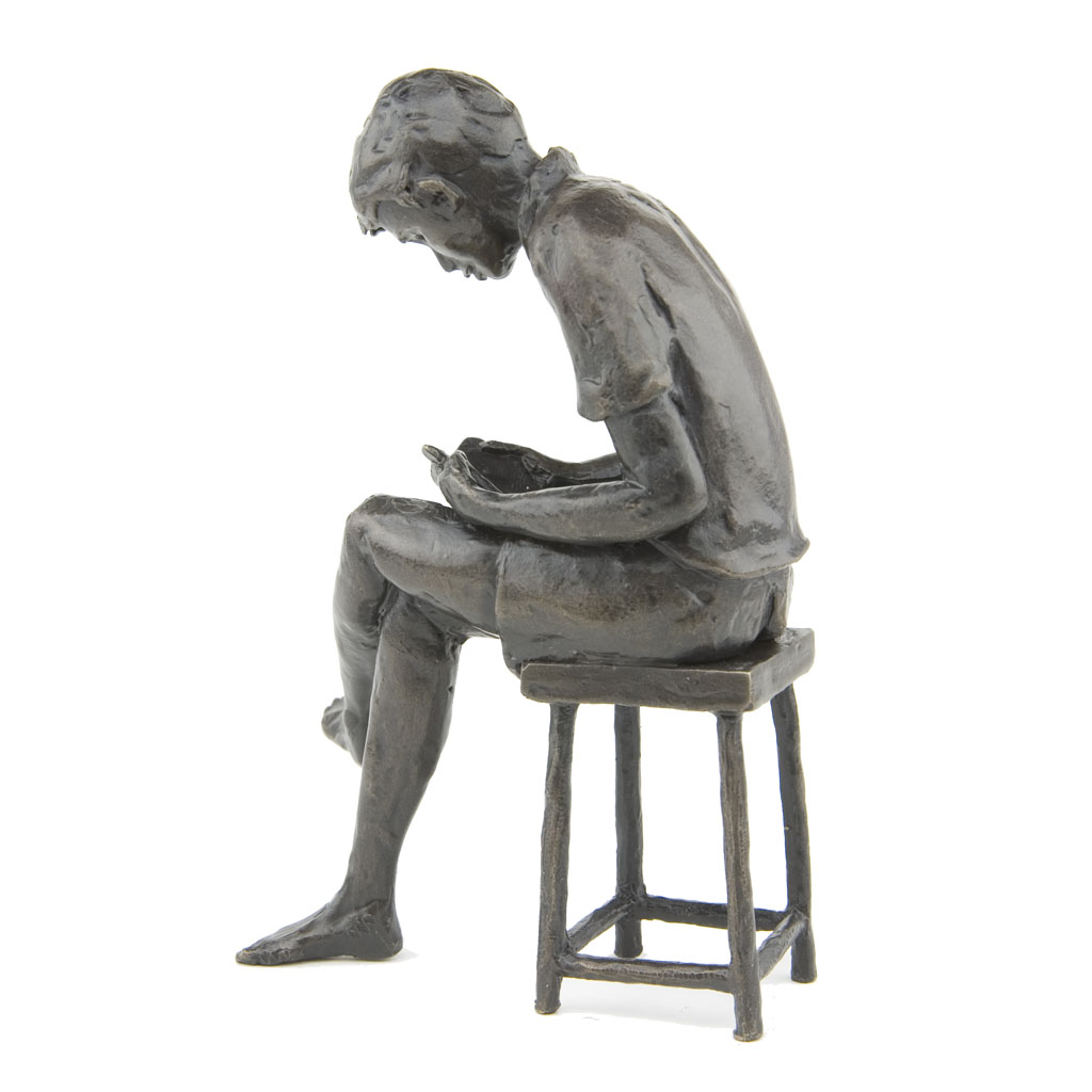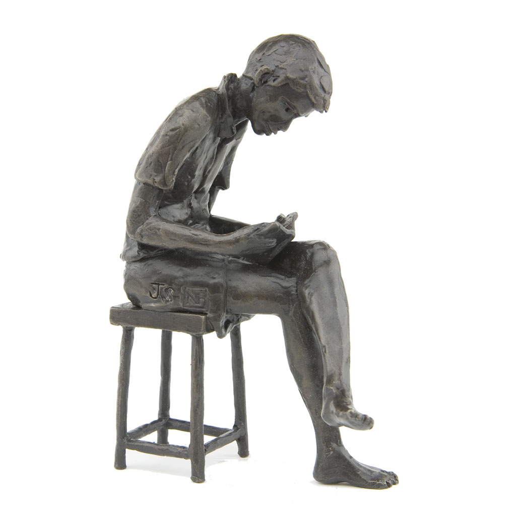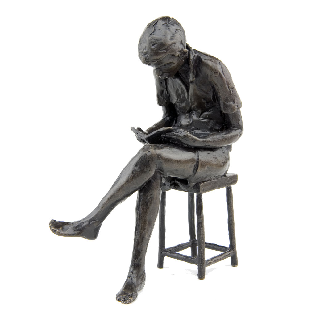 Depicting a boy sitting on a stool and reading a book, the sculpture is presented in a high quality English hand made gift box and is accompanied by a numbered booklet of information, signed by the artist, Jonathan Sanders. The booklet is your guarantee that this is an original foundry casting of Jonathan Sanders’s work that he has personally approved.