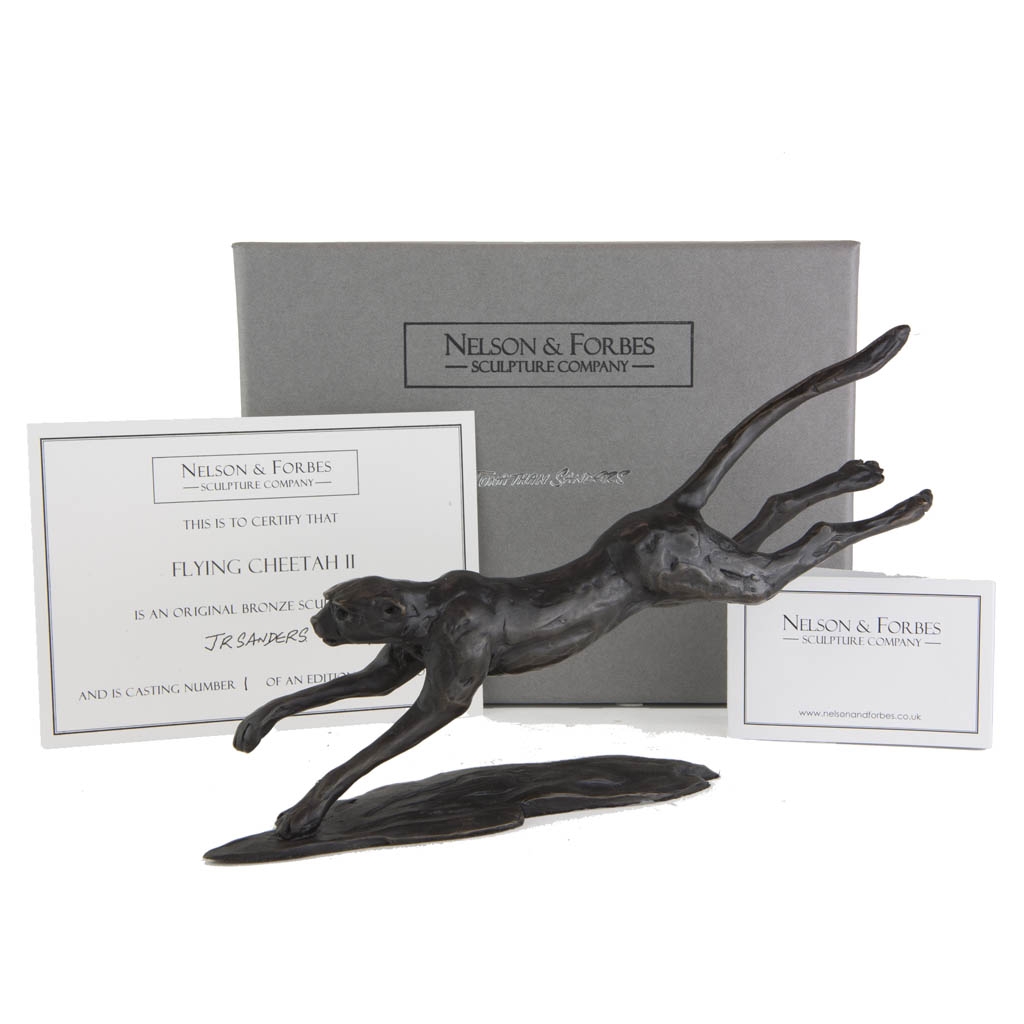 Whether displayed individually, or accompanied by complimentary sculptures from the Jonathan Sanders Cheetah collection, including Racing Cheetah, Cheetah on Branch, Seated Cheetah and Lying Cheetah,  ‘Flying Cheetah II’ will make a stunning addition to your home.
