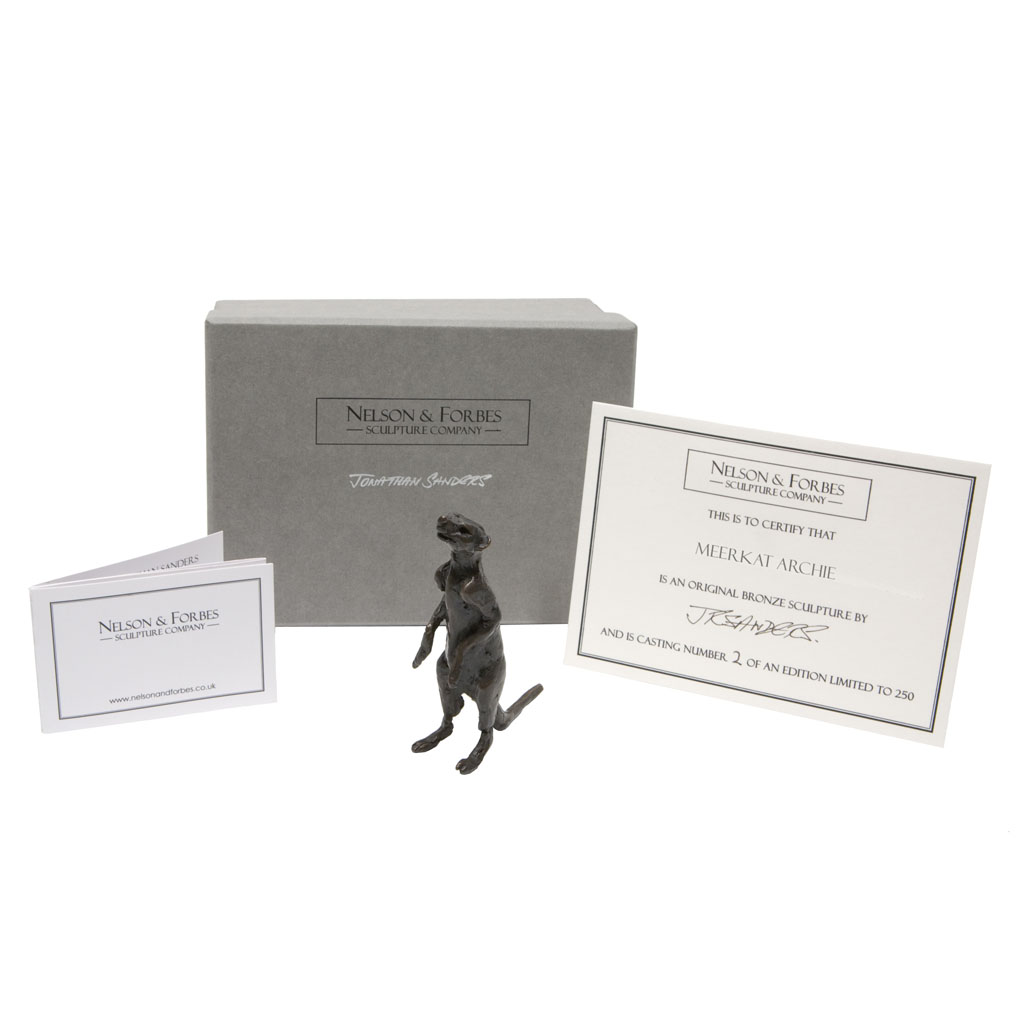 This Jonathan Sanders bronze sculpture of a meerkat was carefully hand cast in a British foundry by Nelson and Forbes, in an edition of  250 castings. It is presented in a high quality English hand made gift box and is accompanied by a numbered certificate of authenticity, signed by the artist, Jonathan Sanders.